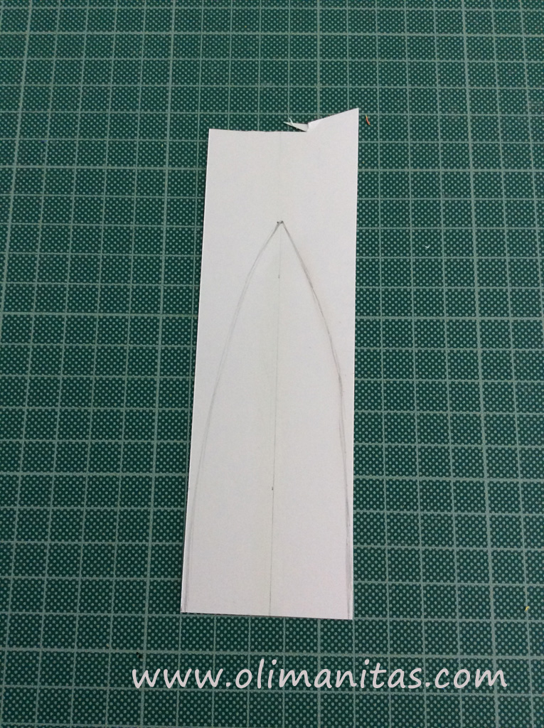 Una vez recortados, marcamos el centro del rectángulo en la base inferior. En la cartulina rosa será a 7’25 cm y en la blanca a 6 cm.