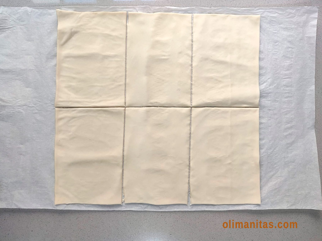 - Con una regla nos ayudamos para dividir el hojaldre en porciones iguales. Mi hojaldre medía 30×30 cm, así que lo dividí en 6 porciones de 10×15 cm.