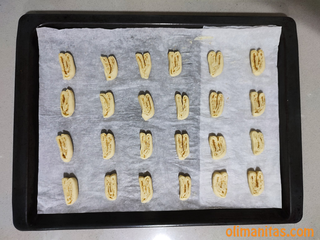- En una bandeja de horno al que le hemos colocado un papel de horno, repartimos todas las palmeritas, dejando algo de espacio entre ellas, ya que estas cogerán mas volumen durante el horneado.