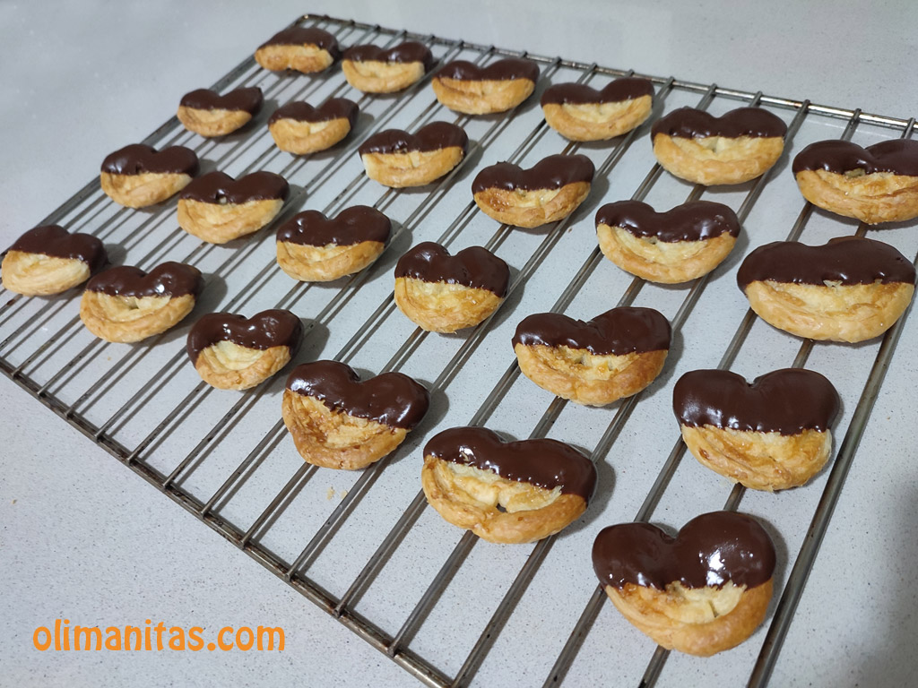 - Una vez horneadas las palmeritas y fundido el chocolate (esperamos a que se atempere un poco), aplicamos la cobertura.